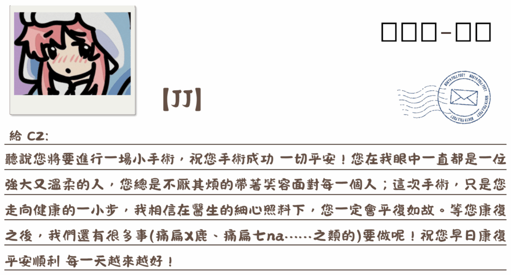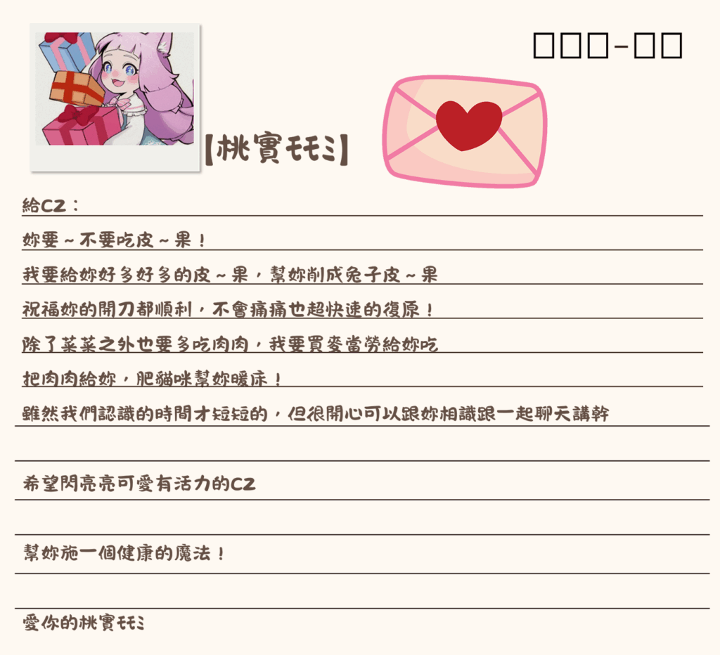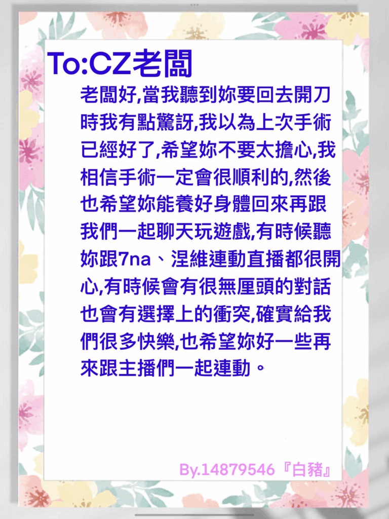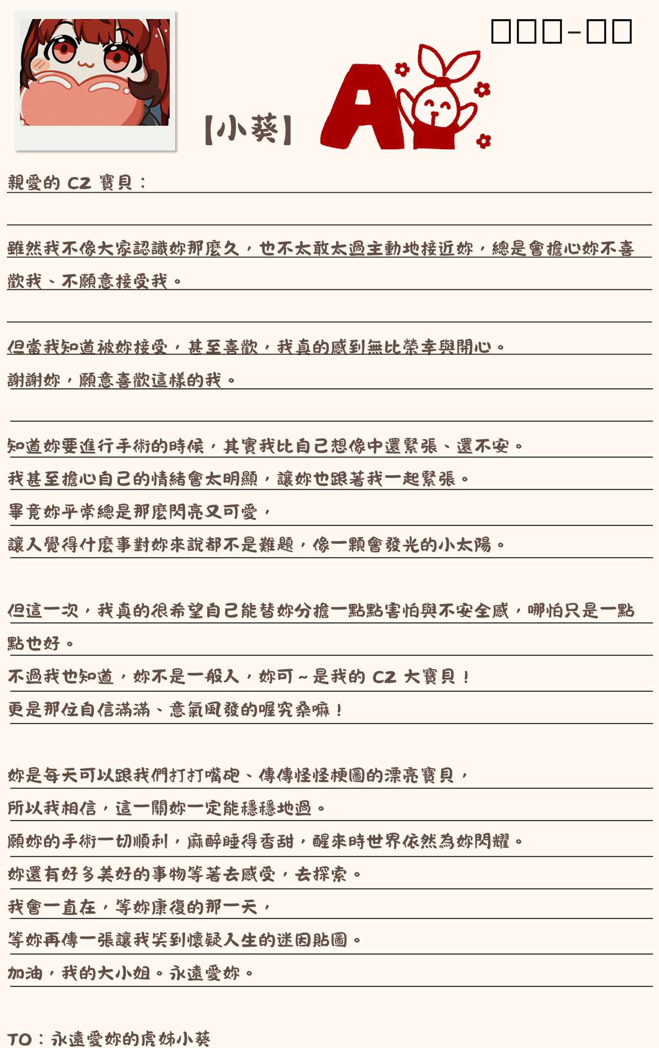 祝福CZ早日康復手術順利( ゚∀゚)つ≡≡≡♡♡♡)`ν゜)グシャ